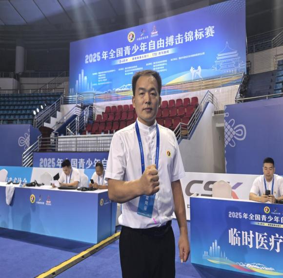 教师王建民应邀担任本次赛事裁判。本次比赛共有来自全国23个省、自治区、直辖市的500余名青少年选手参加,为保障赛事顺利推进并加强裁判队伍管理,充分发挥党员先锋模范作用,赛事期间成立了临时党支部,王建民老师当选为支部纪检委员,并牵头组织学习了中央八项规定精神,强化责任意识与纪律观念。王建民老师多年来持续参与全国各级自由搏击赛事执裁工作,凭借扎实的专业素养、丰富的执裁经验以及对竞赛规则的深入理解,在比赛中做到公正判罚、严肃认真、恪尽职守,其专业表现和奉献精神赢得了裁判组的一致认可,被评为本次比赛“优秀裁判员”。